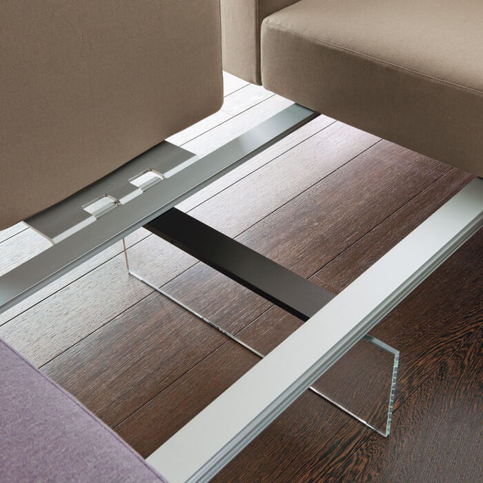 Air ha una modularità senza eguali: ognuno può scegliere profondità , larghezza e altezza di sedute e schienali per creare il divano perfetto per i propri spazi. Un divano lineare può così diventare anche un’elegante composizione a penisola, un comodo letto per gli ospiti o una chaise longue solamente ruotando i moduli. I supporti in robusto vetro temperato agganciati al telaio conferiscono grande leggerezza nelle forme e sono una soluzione dal design elegante. La staffa di aggancio-sgancio garantisce semplicità e resistenza, unite a una flessione controllata dei materiali. L’innovativo telaio in alluminio e la grande modularità di sedute e schienali permettono infinite configurazioni da modificare in base alle esigenze.