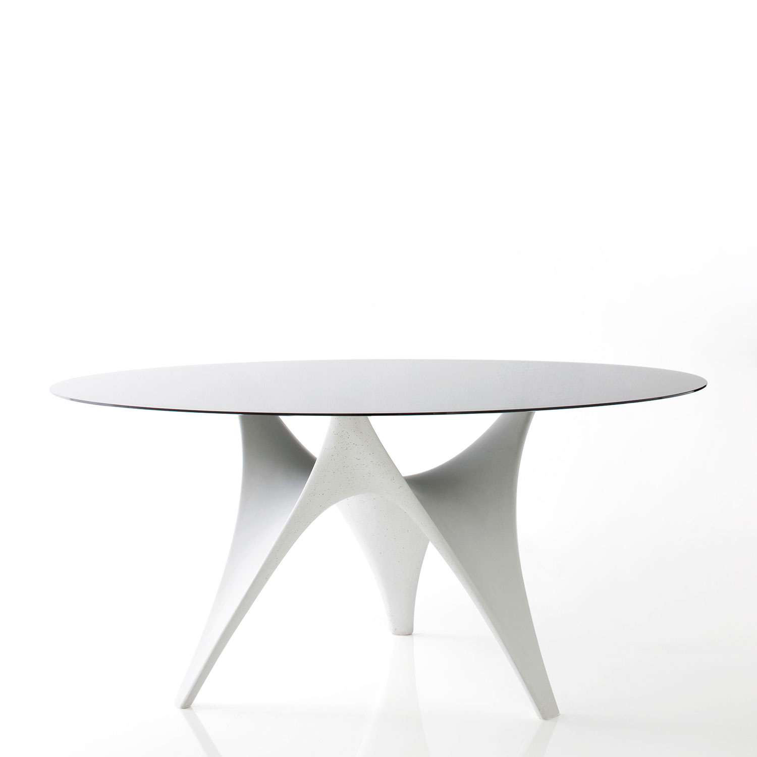Disegnato da Foster + Partners per Molteni&C, il tavolo Arc è tavolo scultura. Il basamento è realizzato con un composto del tutto innovativo, fatto di cemento e fibre, stampato in un blocco unico e colorato in massa. Il piano sopra, tondo o ovale, è in vetro trasparente extrachiaro bisellato sul bordo (ad eccezione dell’ovale 300×140).