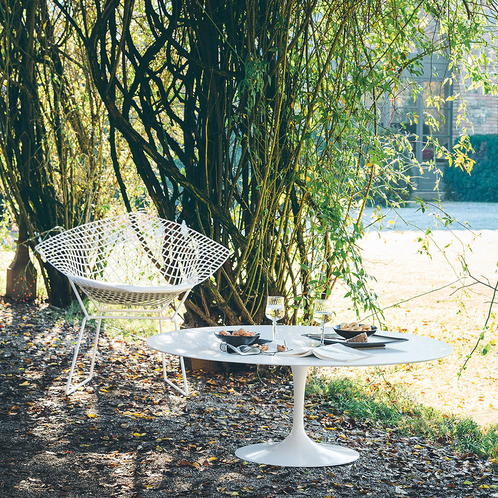 Bertoia Diamond è una poltroncina di Harry Bertoia per Knoll. Base realizzata con tondini d’acciaio cromo lucido bianco o neri saldati con finitura Rilsan per outdoor.