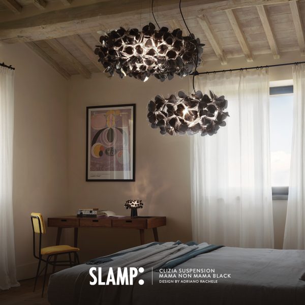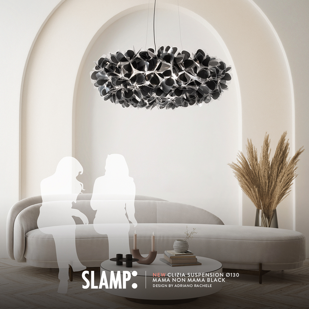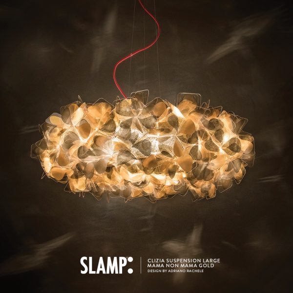 Per i suoi 10 anni Clizia Mama Non Mama si veste di nuovi colori: Oro e Nero assumendo ancora più forza e bellezza. La nuova versione da 130 cm di diametro in Policarbonato si presta in maniera eccelsa ai progetti più ambiziosi. La colorazione oro è figlia di una ricerca incessante e di una lavorazione mai usata fino ad ora: l’applicazione a freddo sul tecnopolimero Slamp di un foil bifacciale. La texture effetto craquelé permette al petalo di essere più resistente, avere uno spessore maggiore e far passare la luce e creare delicati giochi di ombre.