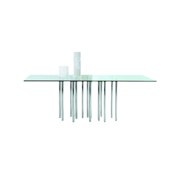 Una serie di tavoli dalla gamba piegata e incartata come un delicato origami, disponibili sia in forma quadrata che rettangolare. Un elemento sapientemente composto da una lamina leggera d’alluminio piegata e da un interno composto da inserti d’alluminio e poliuretano espanso per dare solidità . I piani sono disponibili in vetro o legno, da comporre con strutture di sostegno in alluminio lucido o laccato lucido. Diamond ha vinto il Red dot design award Best of the best 2005.