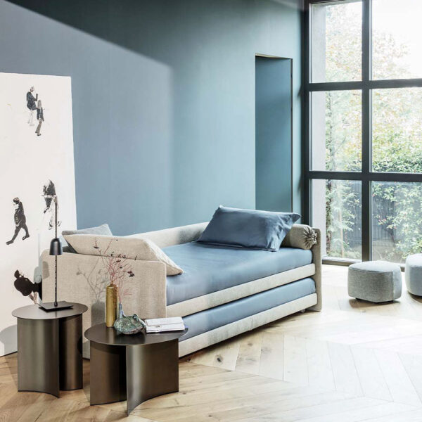 Duetto è un pratico e versatile sistema componibile progettato da Flou nel 1992 che ben si adatta a molteplici esigenze. La compatibilità del sistema lo rende facilmente trasformabile in modo da svolgere più funzioni. Può essere infatti letto matrimoniale, dormeuse, divano o letto singolo a cui si può affiancare un secondo letto dotato di un meccanismo che consente di portarlo facilmente all’altezza del primo letto. E’ inoltre possibile dotarlo di due capienti cassetti contenitore da posizionare sotto il primo letto. Duetto, completamente sfoderabile grazie al velcro, si può rivestire con qualsiasi tessuto, pelle o Ecopelle della collezione Flou.