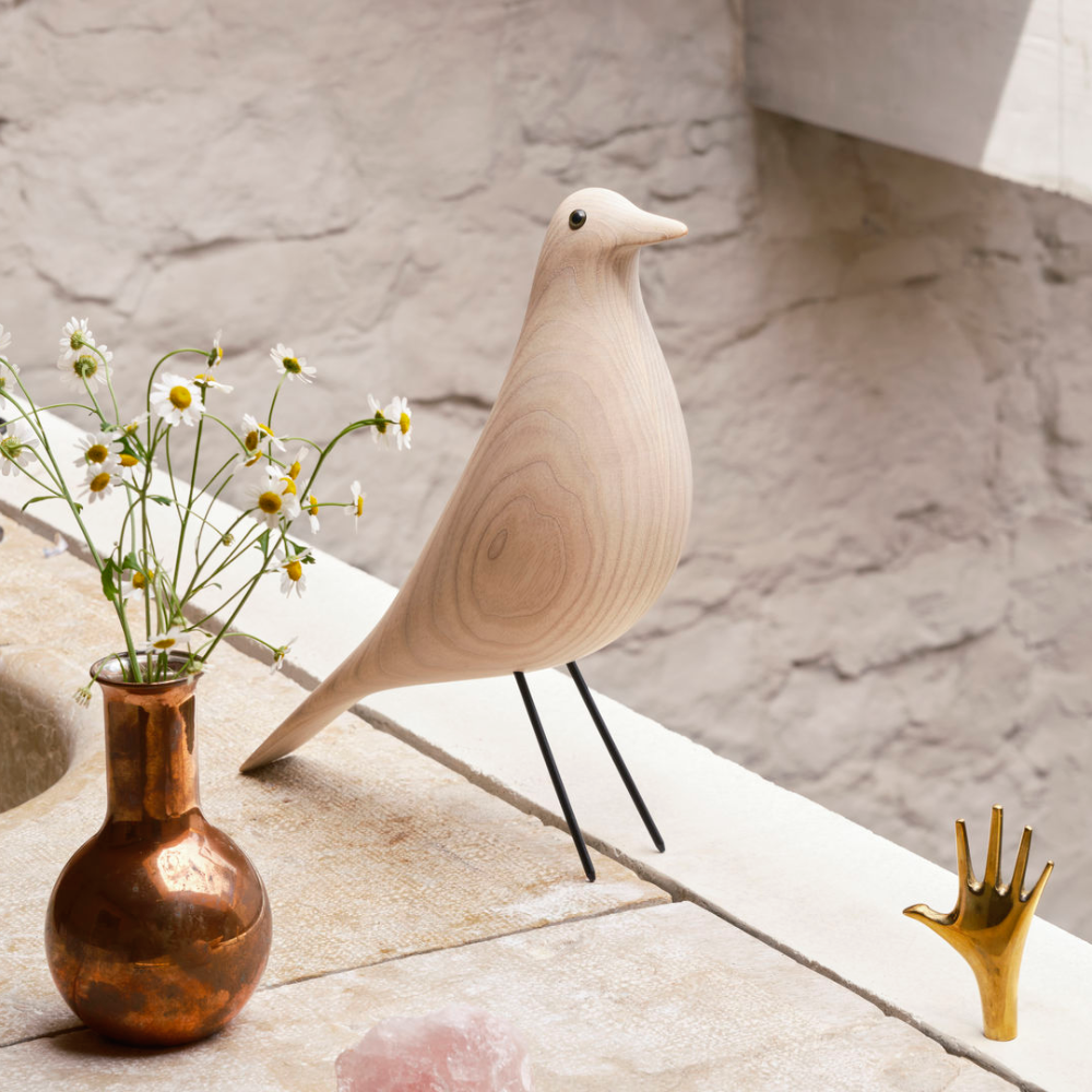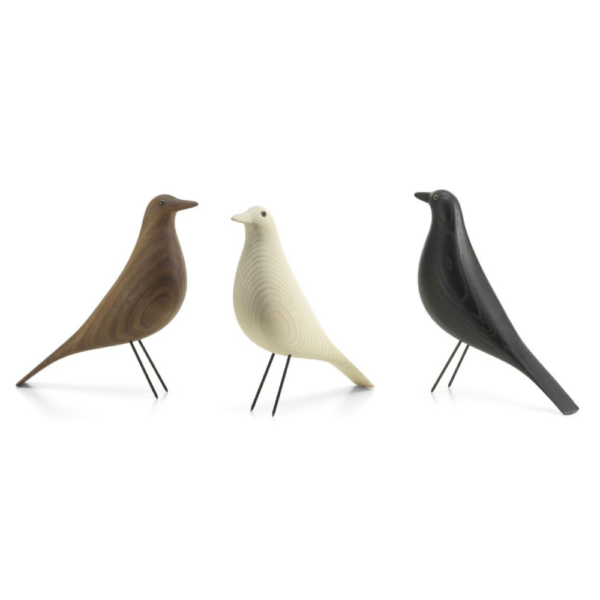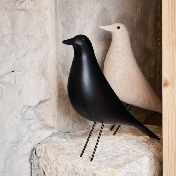 Per decenni, la figura di un uccello nero scolpito nel legno ha occupato un posto centrale nella Eames House, come un artefatto particolarmente pregiato tra gli oggetti posseduti da Charles & Ray Eames. Hanno utilizzato frequentemente l’House Bird come oggetto decorativo in numerosi servizi fotografici. Corpo: frassino cotton white. Zampe: filo di ferro nero. Prodotto da Vitra.