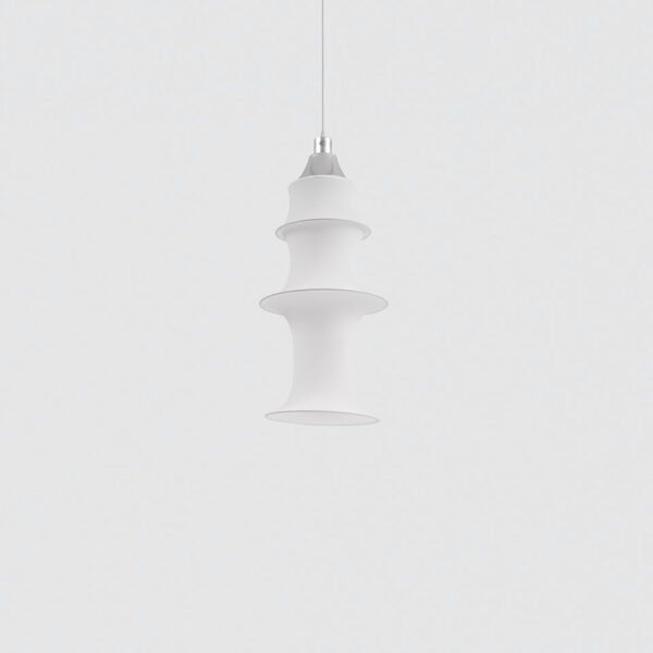 Falkland di Artemide è una lampada a sospensione la cui forma nasce dalla tensione di un tubo di filanca e dal peso di alcuni anelli metallici: è una forma spontanea, generata unicamente dalla tensione delle forze interne che la compongono. Sette anelli di metallo di diametri diversi, un tubo di tessuto, una sola lampadina e un riflettore in alluminio che asseconda la forma delle curve del tessuto.