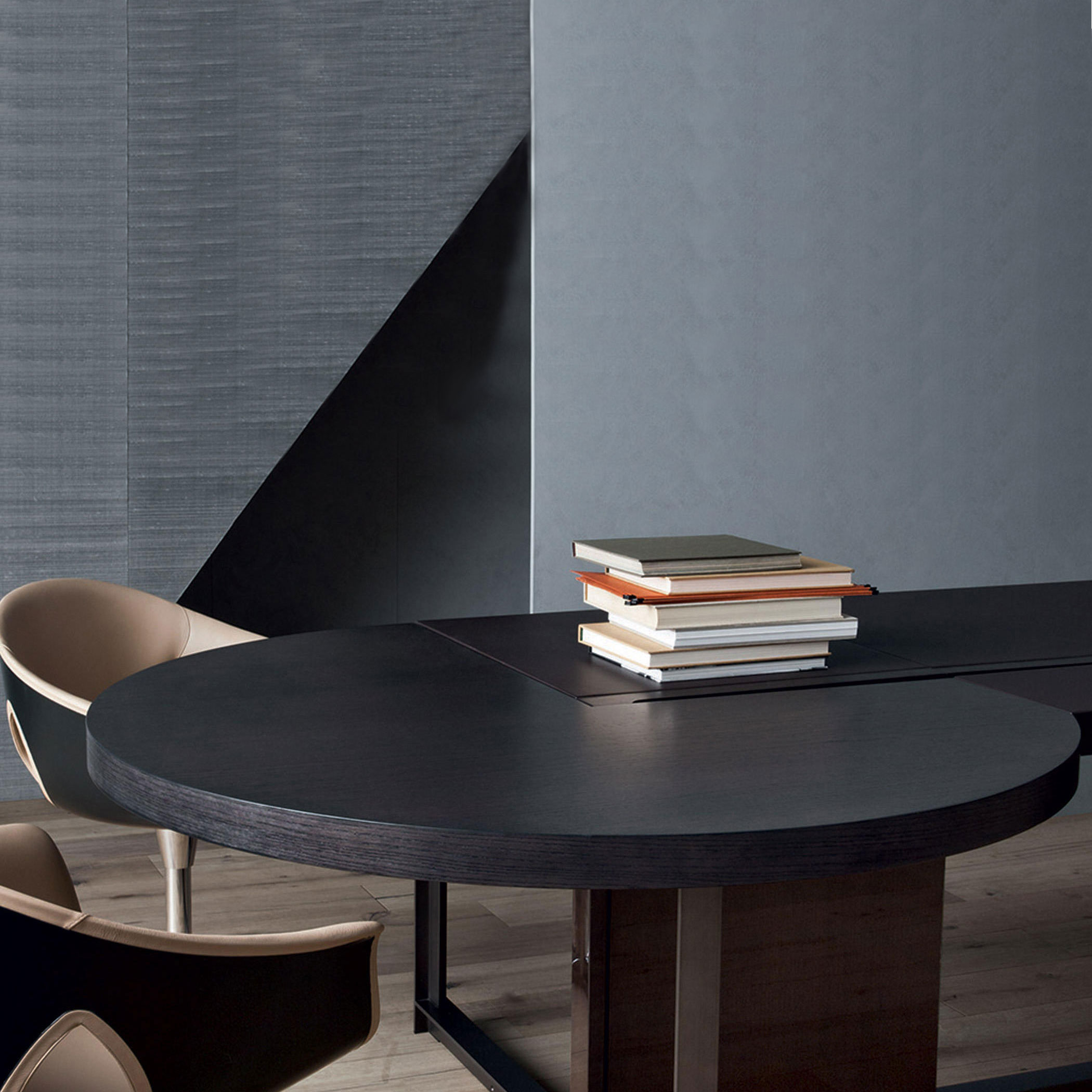 Dotata di un cassetto ad estrazione totale e rientro ammortizzato, e di un secondo cassetto accessibile dall’interno, la cassettiera è provvista di serratura a chiave posizionata sul fianco esterno. Il rivestimento frontale del cassetto è in Pelle Frau® del Color System con struttura interna verniciata nero testurizzato antigraffio. Sul lato opposto al cassetto, cioè lato “guest area”, la cassettiera è dotata di un vano a giorno. La “Meeting area” può essere installata esclusivamente sul lato dove è presente la colonna passacavi, che può essere montata a destra o a sinistra della scrivania rispetto alla posizione del fruitore determinandone il verso. La struttura portante è in acciaio satinato verniciato piombo con caratteristica sezione a “T”; piedini registraili in materiale plastico. Il piano, rivestito in Pelle Frau® del Color System, è impreziosito da una striscia in Rovere, Piombo o Tabacco, con finitura opaca che corre su tutta la lunghezza del piano e separa l’area di lavoro dalla “Guest area”, consentendo anche l’uscita dei cavi elettrici grazie ad una fessura. La “Guest area” individua la zona del piano di lavoro, al di la della striscia in Rovere, riservata all’ospite ed è disponibile rivestita in Pelle Frau® del Color System come il resto del piano o con impiallacciatura in Rovere opaco, Piombo o Tabacco, in abbinamento alla colonna o al mobile. Disponibile con pannello di cortesia in alluminio verniciato nero opaco rivestito in pelle. Piano, “Guest area” (se scelta in pelle), pannello di cortesia e frontale dei cassetti sono rivestiti in Pelle Frau®; mobile contenitore, cassettiera, colonna passacavi, “Guest area” (se scelta in legno), fascia centrale del piano hanno fiitura in legno opaco o lucido.