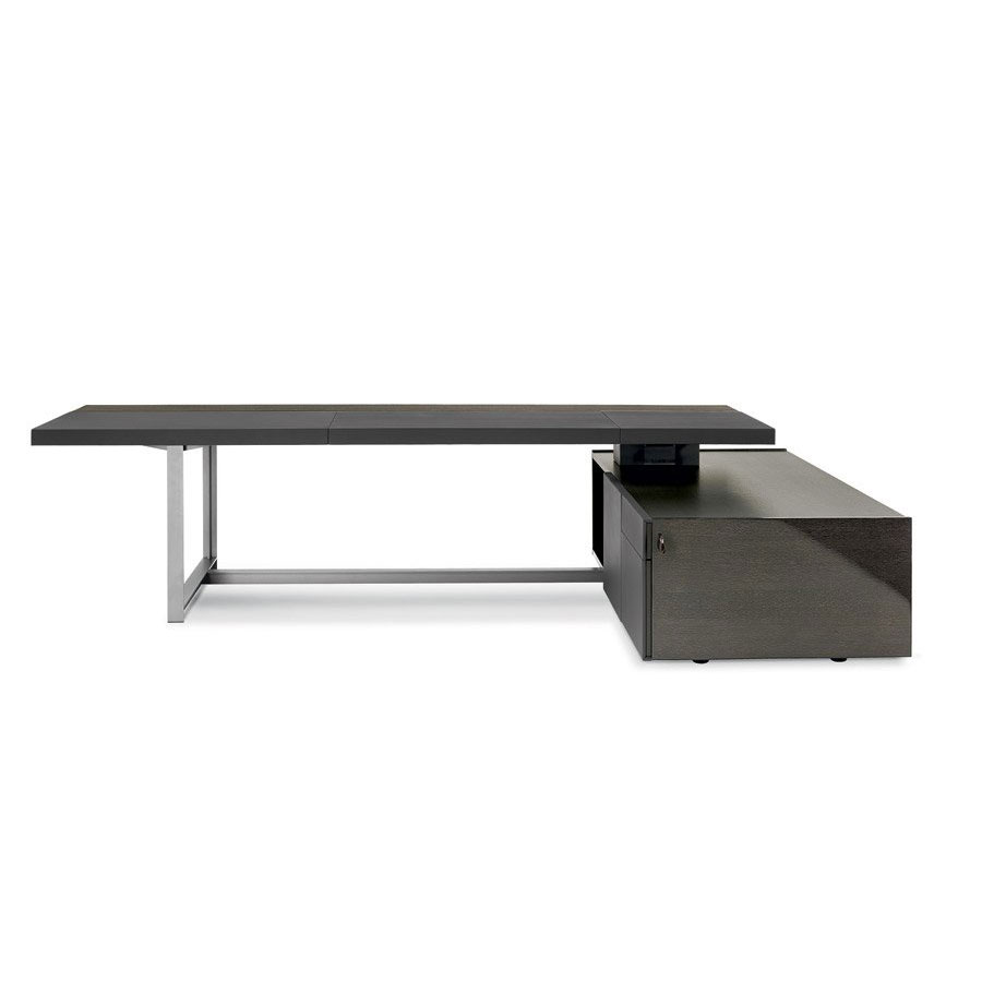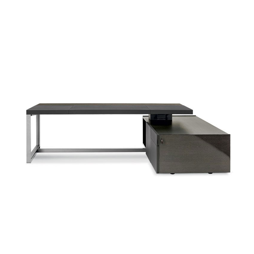 La struttura portante è in acciaio satinato verniciato piombo con caratteristica sezione a “T”; piedini registraili in materiale plastico. Il piano, rivestito in Pelle Frau® del Color System, è impreziosito da una striscia in Rovere, Piombo o Tabacco, con finitura opaca che corre su tutta la lunghezza del piano e separa l’area di lavoro dalla “Guest area”, consentendo anche l’uscita dei cavi elettrici grazie ad una fessura. La “Guest area” individua la zona del piano di lavoro, al di la della striscia in Rovere, riservata all’ospite ed è disponibile rivestita in Pelle Frau® del Color System come il resto del piano o con impiallacciatura in Rovere opaco, Piombo o Tabacco, in abbinamento alla colonna o al mobile. Il piano è dotato, sul lato della colonna passacavi, di uno sportello scorrevole che consente l’accesso ad un piccolo vano interno al piano, corredato di vassoio portapenne e utile alla fuoriuscita dei cavi dalla colonna che, attraverso la fessura presente lungo la striscia in Rovere, escono sul piano di lavoro. Il mobile contenitore è attrezzato con due cassetti e un classificatore che nasconde al suo interno un ulteriore cassetto. La struttura interna di cassetti e classificatore è verniciata nero testurizzato antigraffio con frontali rivestiti in pelle. Serratura a chiave posizionata sul fianco del mobile per la chiusura dei soli due cassetti posizionati all’estremità della scrivania. Le versioni Standard e Large sono attrezzate nel lato opposto con un vano a giorno con ripiano in vetro e divisorio verticale in acciaio satinato verniciato color piombo. Disponibile con pannello di cortesia in alluminio verniciato nero opaco rivestito in pelle. Piano, “Guest area” (se scelta in pelle), pannello di cortesia e frontale dei cassetti sono rivestiti in Pelle Frau®; mobile contenitore, cassettiera, colonna passacavi, “Guest area” (se scelta in legno), fascia centrale del piano hanno fiitura in legno opaco o lucido.
