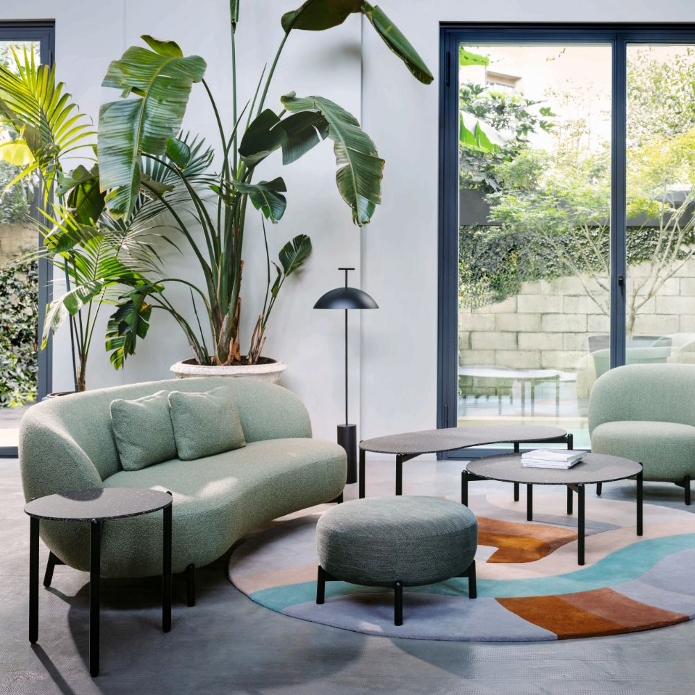 LUNAM è un’avvolgente collezione living che racconta le atmosfere sognanti di un paesaggio lunare. Un’essenziale struttura in metallo verniciato sostiene i volumi generosi degli imbottiti. Divano, poltrona e pouf sono proposti in morbido bouclé o tessuto mélange – opzione contract – nelle tonalità del verde oliva, del petrolio, della terra di Siena e dei grigi.