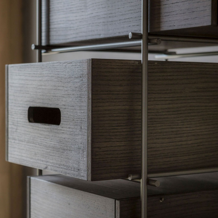 Manolo di Mogg è una scarpiera con struttura in metallo brunito e cassetti in massello di frassino tinto moka. Manolo nasce dall’esigenza di dare dignità ad un prodotto ritenuto sempre secondario e povero. Manolo è un nuovo concetto di scarpiera, un prodotto stiloso e funzionale. Finalmente una scarpiera che non si deve nascondere ma che vuole essere esibita nell’ambiente domestico. Dimensioni: cm 40x40x182.5 h.