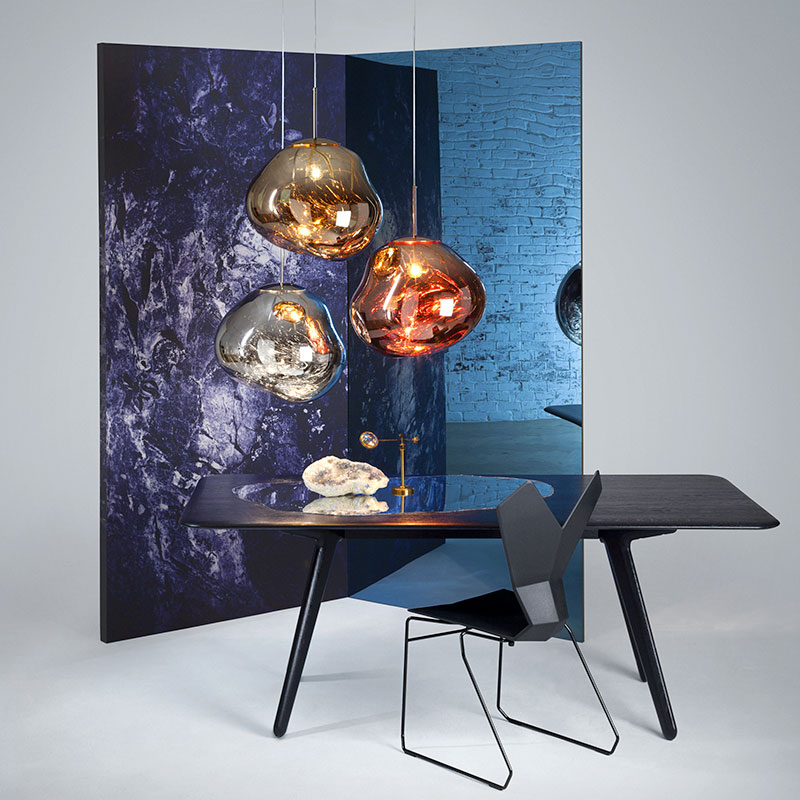 Melt Mini è la collezione di lampade a sospensione firmata Front per Tom Dixon. Una serie di sfere distorte dalla finitura traslucida nei colori oro, cromo e rame, che diventano trasparenti e fluide una volta accese. La speciale struttura in policarbonato di questa sfera deforme e luminosa si avvale della tecnologia moderna che gli permette di avere una finitura lucida e metallizata all’esterno, ma quando si accende la lampadina, svela un’anima luminosa sorprendente. Tom Dixon gioca con le forme e i materiali plasmando una realtà alternativa, brillante ed ultramoderna. Fonte luminosa: 6W LED inclusa, cavo cm. 250 trasparente incluso. Dimensione: L. 28 cm – H. 27 cm