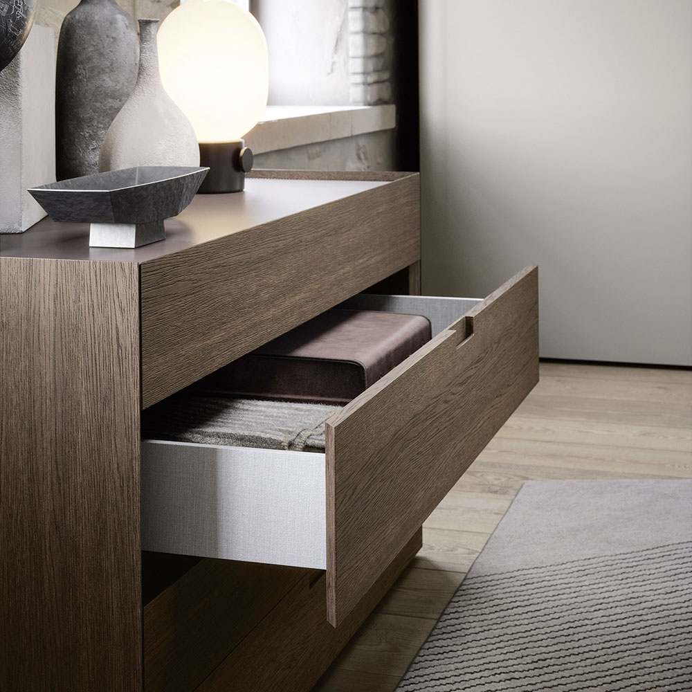 Precisa, geometrica e ricercata la collezione Quarantacinque per la zona notte si caratterizza per un design moderno ed un’attenta definizione dei suoi particolari. Rovere terra, rovere miele e rovere carbone le finiture disponibili, con top in vetro laccato, light stone e cuoio.