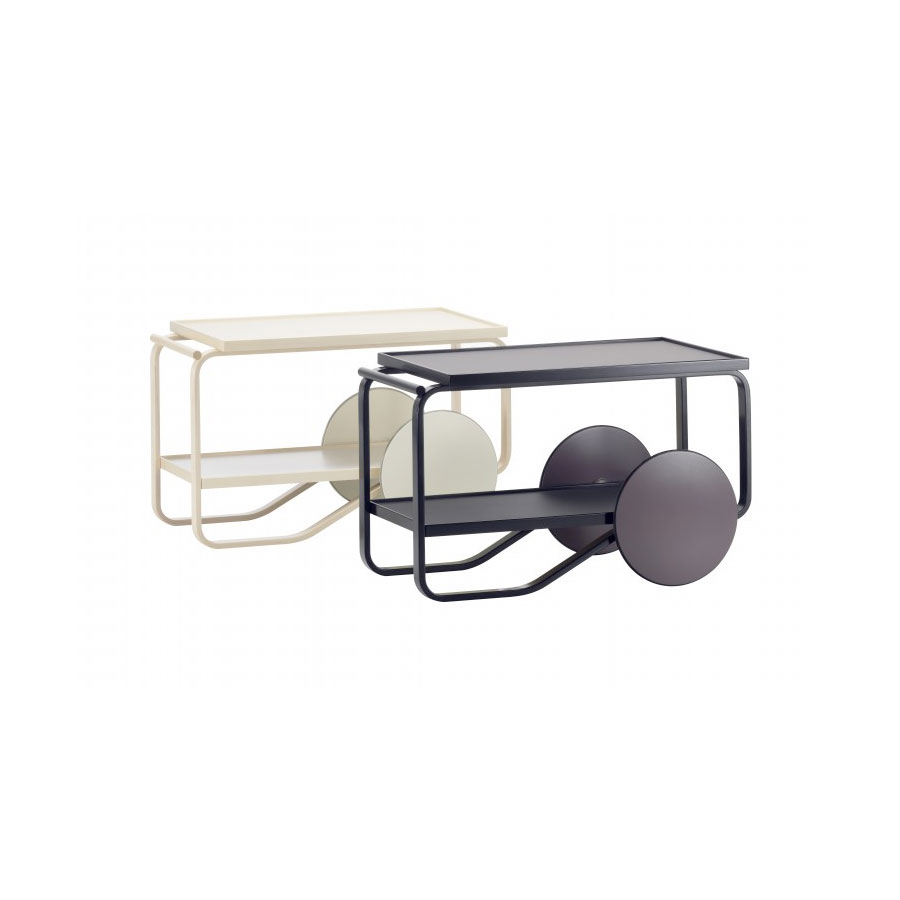 Il Tea Trolley 901 è un tavolino-carrello molto versatile, progettato nel 1936 da Alvar Aalto. Un carrello che si sposta in maniera molto facile, grazie alle grandi ruote. Realizzato in legno di betulla con due mensole in laminato e ruote con anello in gomma nera. Hella Jongerius, designer dei nostri tempi, ha voluto rivisitare questo carrello con struttura in legno in finitura naturale o laccata nera e mensole in laminato bianco o nero.